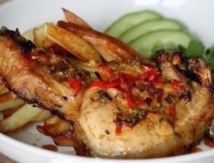 6. Отбивные очищаем от крупных кусочков маринада, чтобы они не горели, и обжариваем с двух сторон до золотистой корочки, примерно по 2 минуты на каждой стороне.