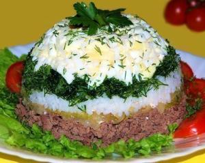 Ингредиенты: Способ приготовления: Печень отвариваем до готовности и натираем на средней терке. Лук нарезаем полукольцами и обжариваем на растительном масле. Рис отвариваем в подсоленной воде и откидываем на дуршлаг. Яйцо натираем на средней терке. Салат выкладываем слоями, промазывая каждый слой майонезом, солим и перчим. Первым слоем выкладываем печень, следующим слоем идет лук, далее слой риса, затем слой укропа и наконец последним слоем выкладываем яйцо. Украшаем по вкусу.